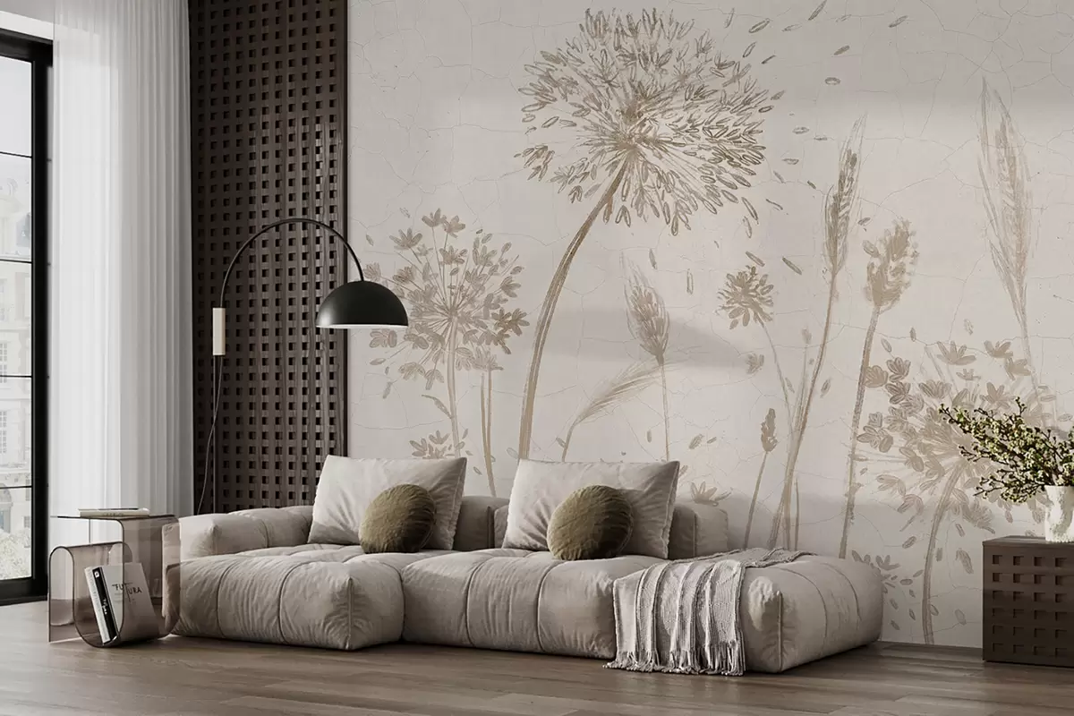 Fototapeedid Võilillede ja muude metsalillede põld pehmel udusel taustal Nr w07921