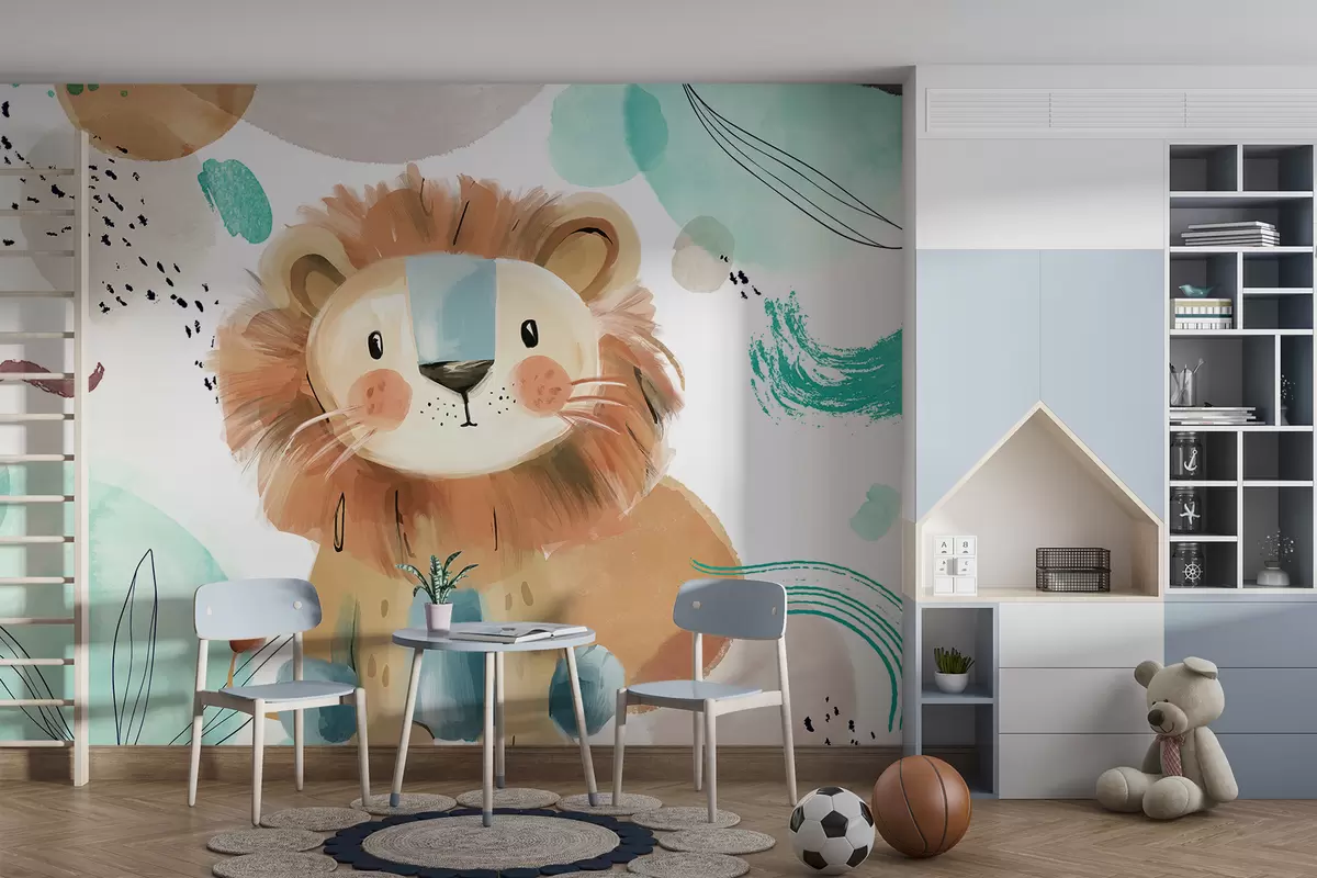 Fototapeedid Armas koomiksilõvi värvilisel abstraktsel taustal pintslitõmmete ja pastelsetes toonides pritsmetega Nr w07924