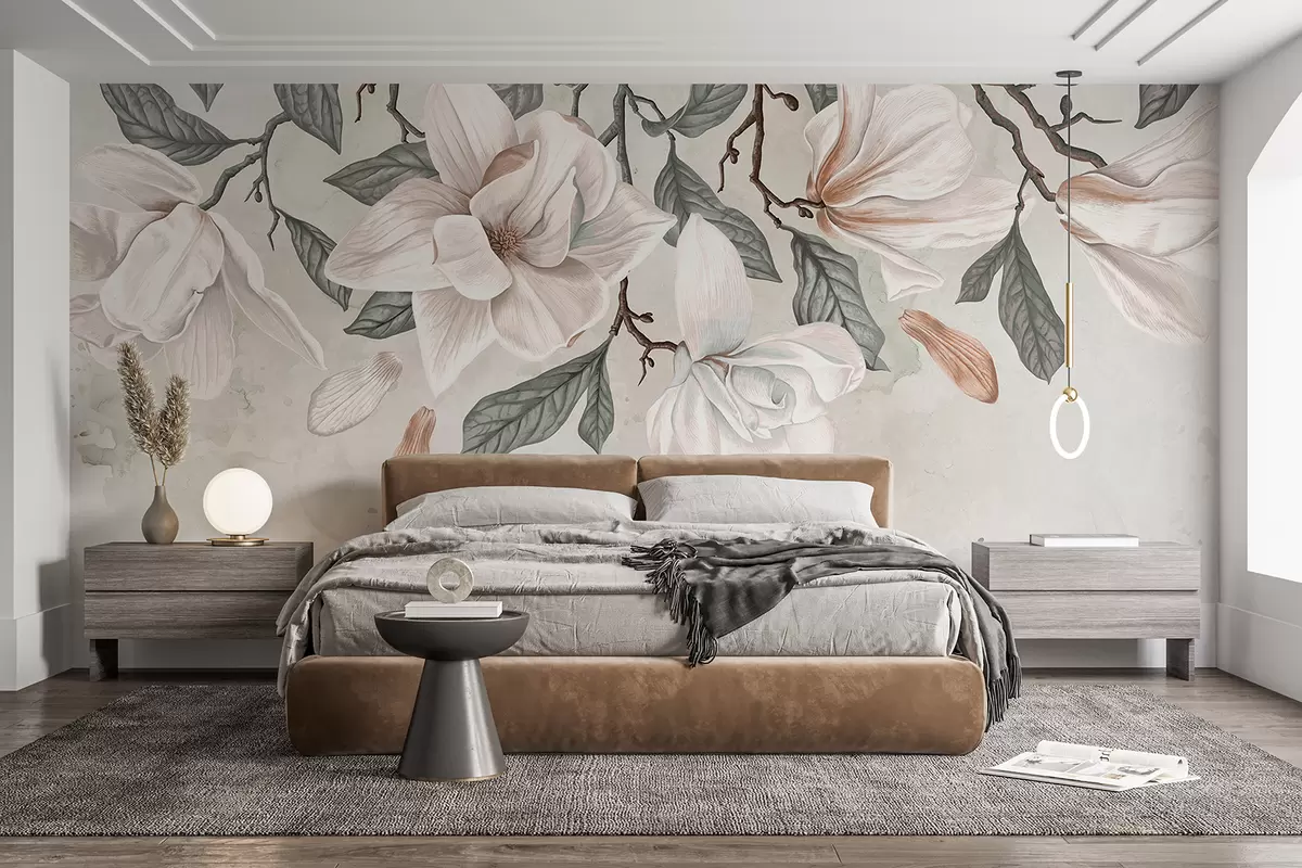 Fototapeedid Õrnroosad ja valged roheliste lehtedega magnooliaõied heledal taustal, pehme lilleline kompositsioon Nr w07977