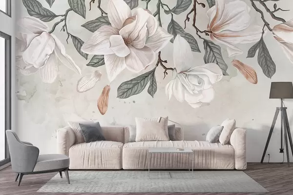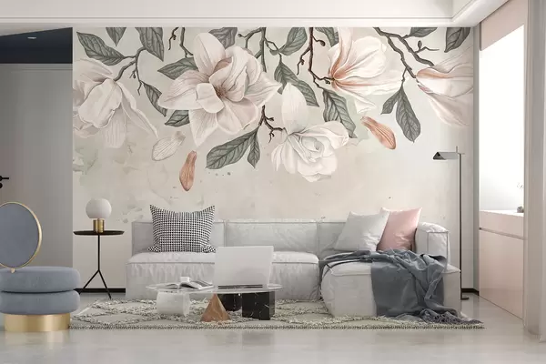 Fototapeedid Õrnroosad ja valged roheliste lehtedega magnooliaõied heledal taustal, pehme lilleline kompositsioon Nr w07977
