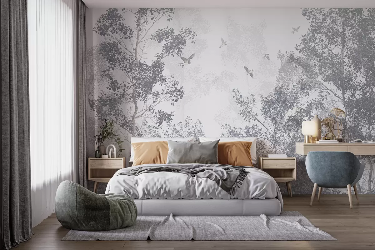 Fototapeedid Hallade lehtede ja okstega puud, taevas lendavad linnud, valge taustaga Nr w07982v1