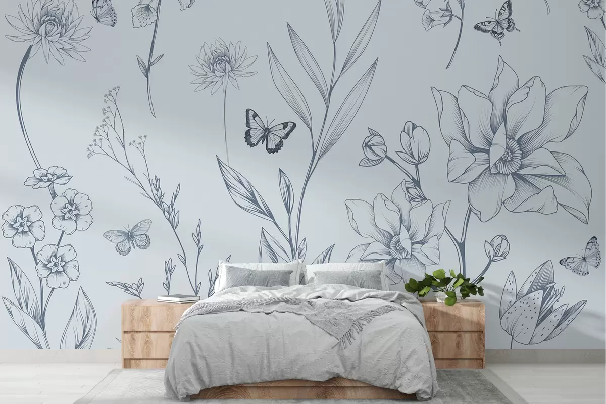 Fototapeedid Boho ühevärvilised sinised lilled ja liblikad Nr w08088v2