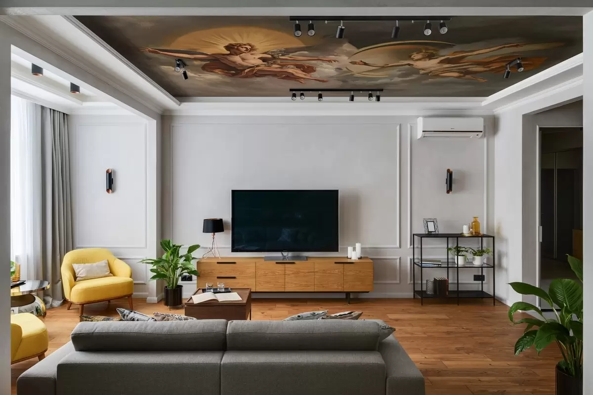 Fototapeedid seinamaaling renessansiaegsete freskode stiilis beežides ja tumedates toonides. Kaks jumala meesfiguuri teineteise poole sirutavad. Nr w08137