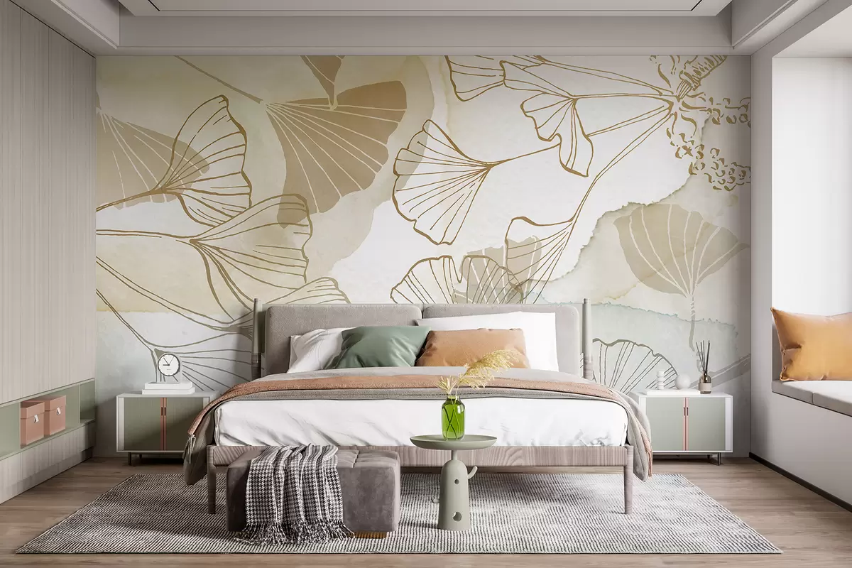 Fototapeedid Õrnade hõlmikpuulehtede muster heledal taustal beeži, punakaspruuni ja sinise tooniga Nr w08157