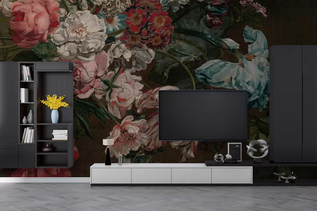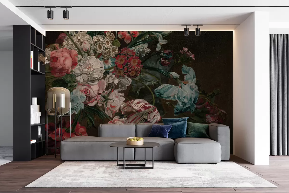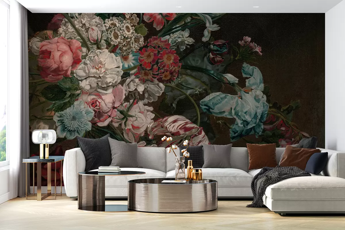 Fototapeedid Vintage värvilised lilled, sealhulgas roosad pojengid, punased nelgid ja valged liiliad tumedal taustal Nr w08163
