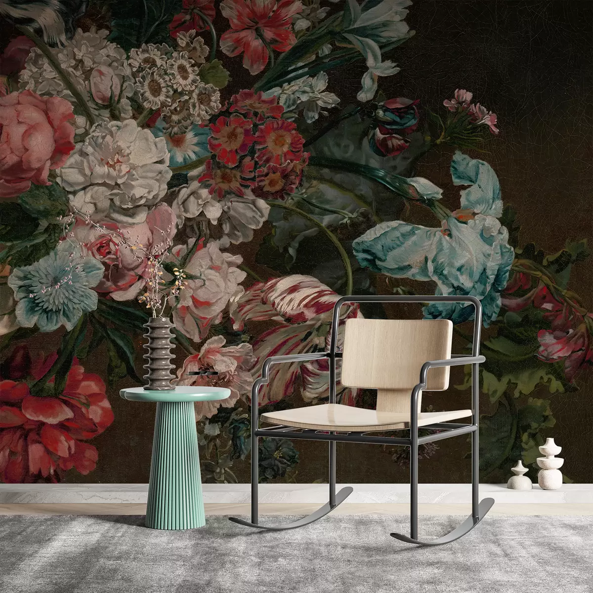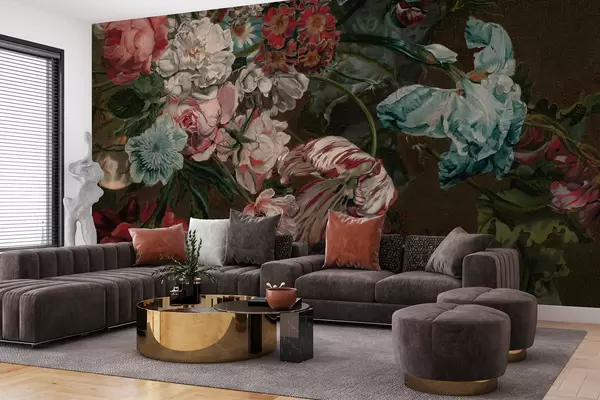 Fototapeedid Vintage värvilised lilled, sealhulgas roosad pojengid, punased nelgid ja valged liiliad tumedal taustal Nr w08163