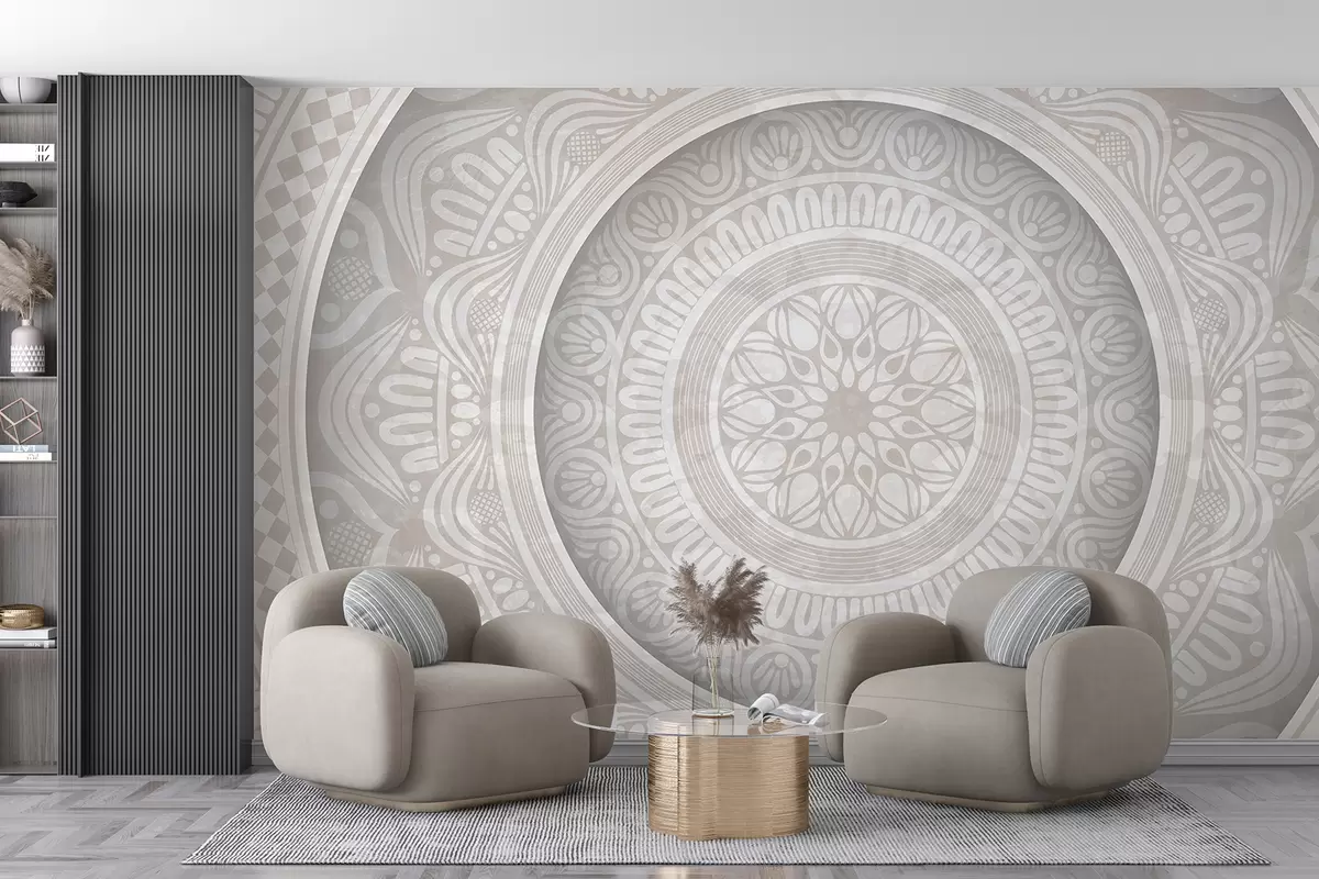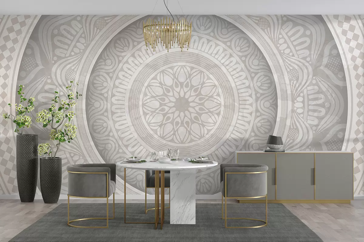 Fototapeedid Detailne sümmeetriline halli-valge mandalatrükk kontsentriliste ringide ja geomeetriliste kujunditega Nr w08182