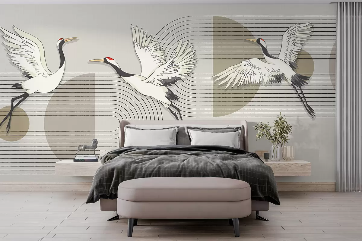 Fototapeedid Kolm valget kraanat lennus kontsentriliste ringidega geomeetrilisel minimalistlikul taustal Nr w08188