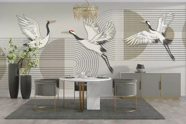 Fototapeedid Kolm valget kraanat lennus kontsentriliste ringidega geomeetrilisel minimalistlikul taustal Nr w08188