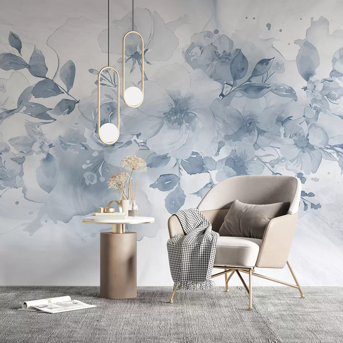 Fototapeedid Pehme, ähmane lillemuster halli ja valge varjundiga, õrnade õite ja lehtedega Nr w08189