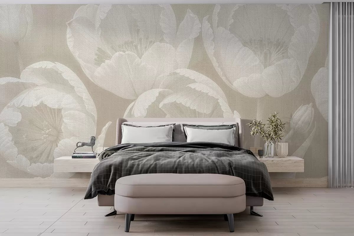 Fototapeedid Joonis valgetest tulpidest, millel on pehme lõuenditekstuuriga roosa ähmane taust minimalismi ühevärvilise prindiga Nr w08193v1