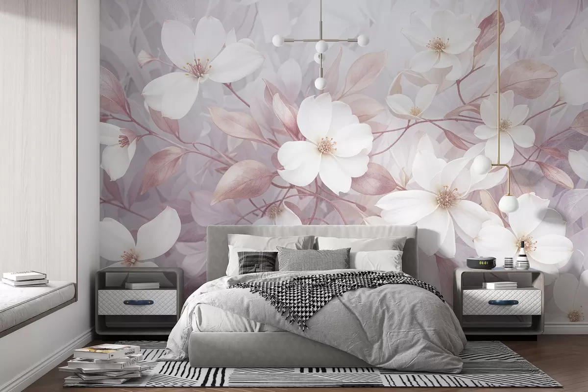 Fototapeedid Õrnroosad ja valged magnooliaõied, mis õitsevad pehmetel ähmastel okstel kahvatul taustal Nr w08196