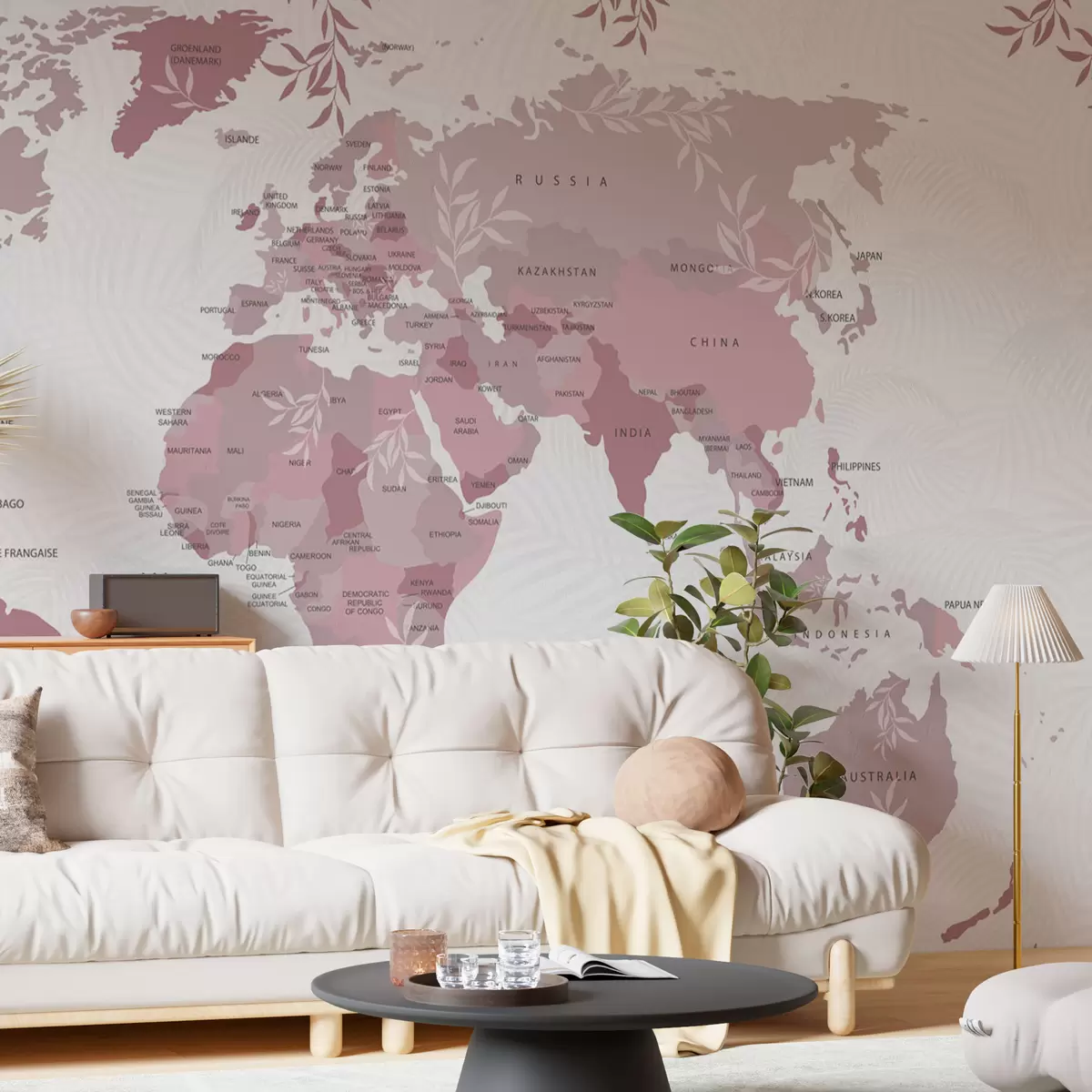 Fototapeedid Stiilne maailmakaart roosade lehtede ja taimedega Nr w08211v3