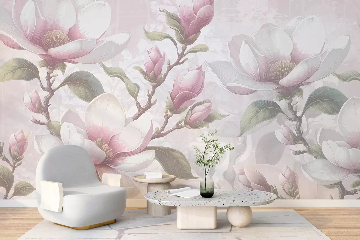 Fototapeedid Õrnroosad magnooliaõied täies õitsengus pehmel, hägusal taustal Nr w08216