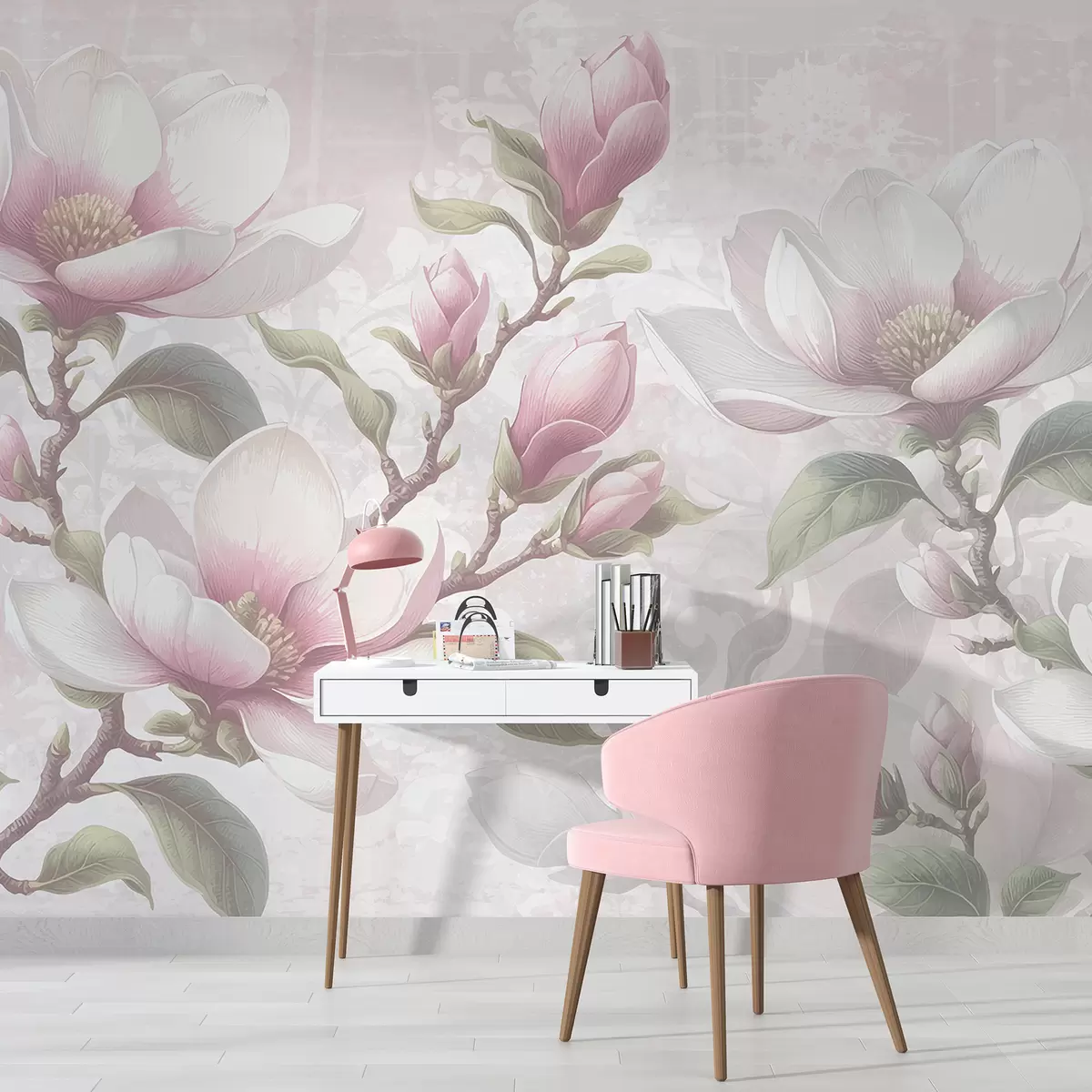 Fototapeedid Õrnroosad magnooliaõied täies õitsengus pehmel, hägusal taustal Nr w08216