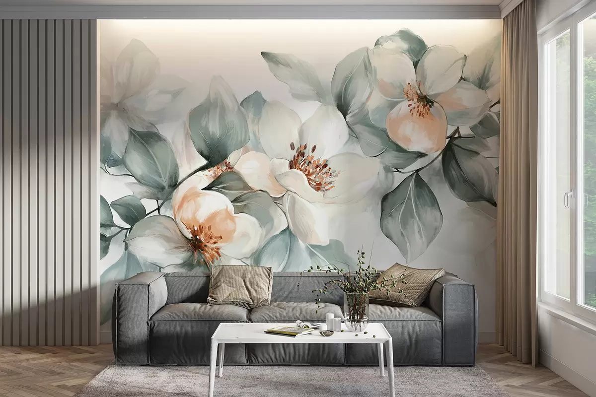 Fototapeedid Õrnad valged ja roosad magnooliaõied pehmete roheliste lehtedega heledal taustal Nr w08220
