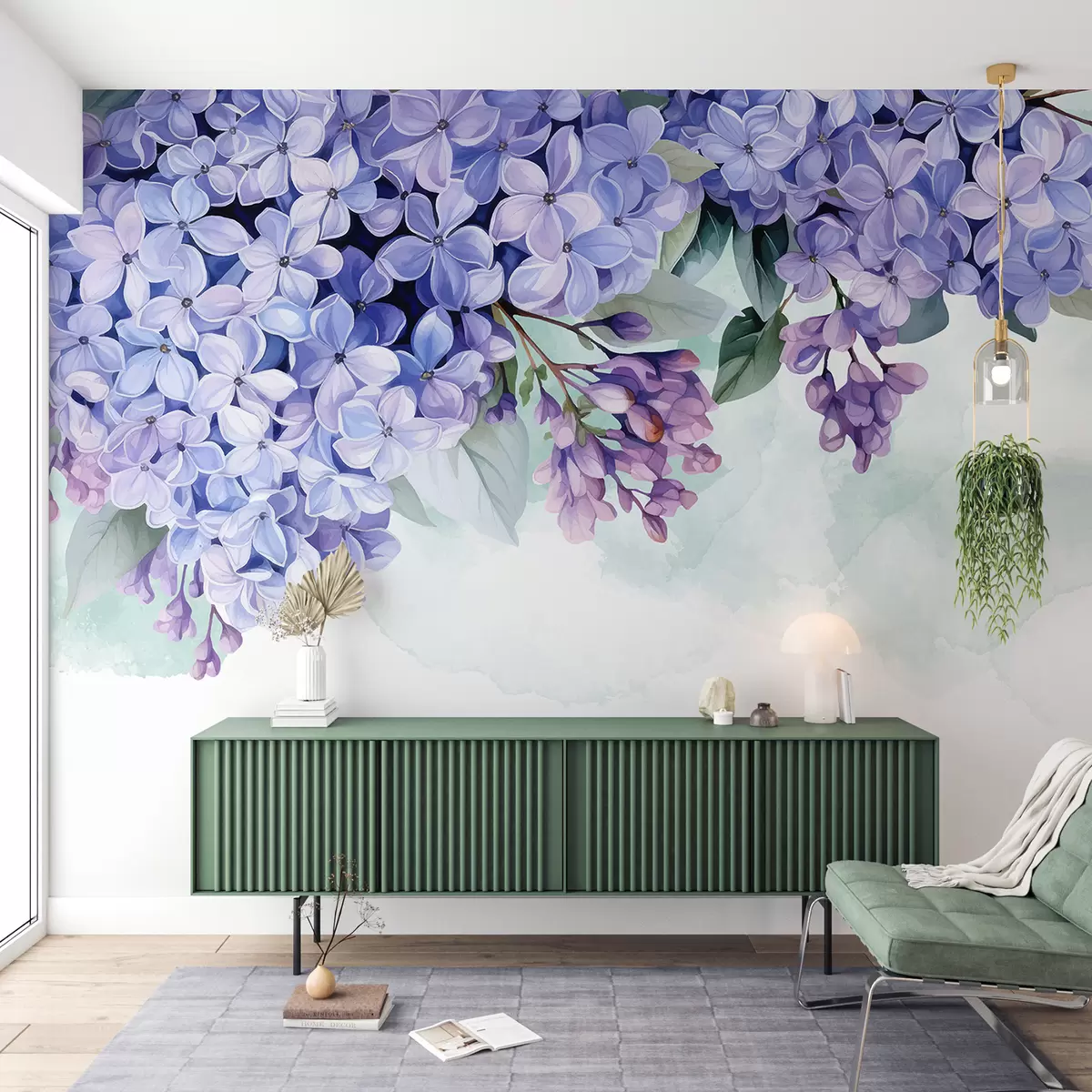 Fototapeedid Erksad lillad roheliste lehtedega hortensiaõied, mis täidavad raami pehmel, udusel taustal Nr w08223
