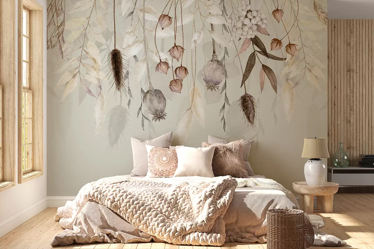 Fototapeedid Pehmel taustal rippuvate kuivatatud lillede, lehtede ja sulgedega õrn lilleseade Nr w08230