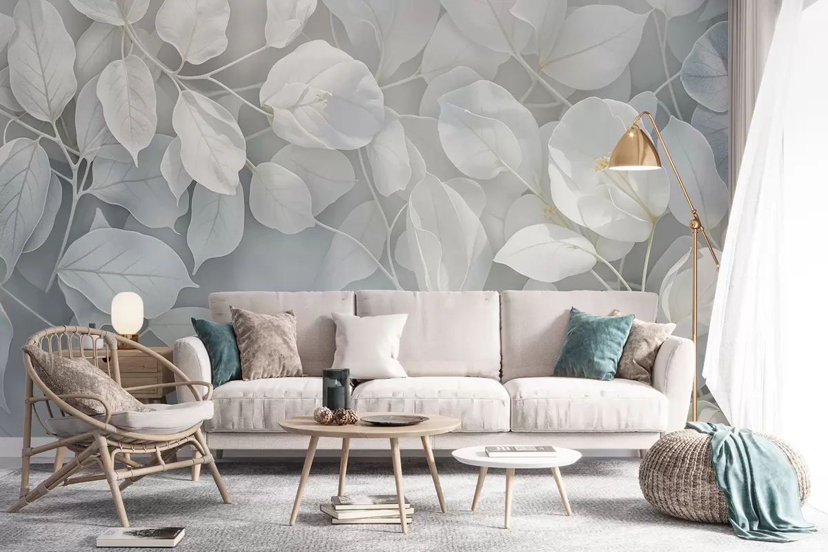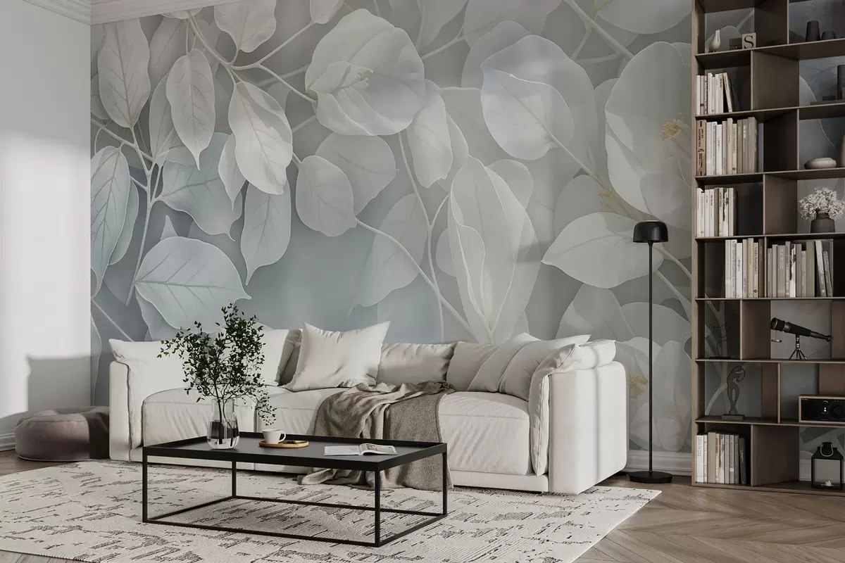 Fototapeedid Pehmed, õrnad valged lilled hallikasroheliste lehtedega ähmasel taustal, loovad rahuliku atmosfääri Nr w08232