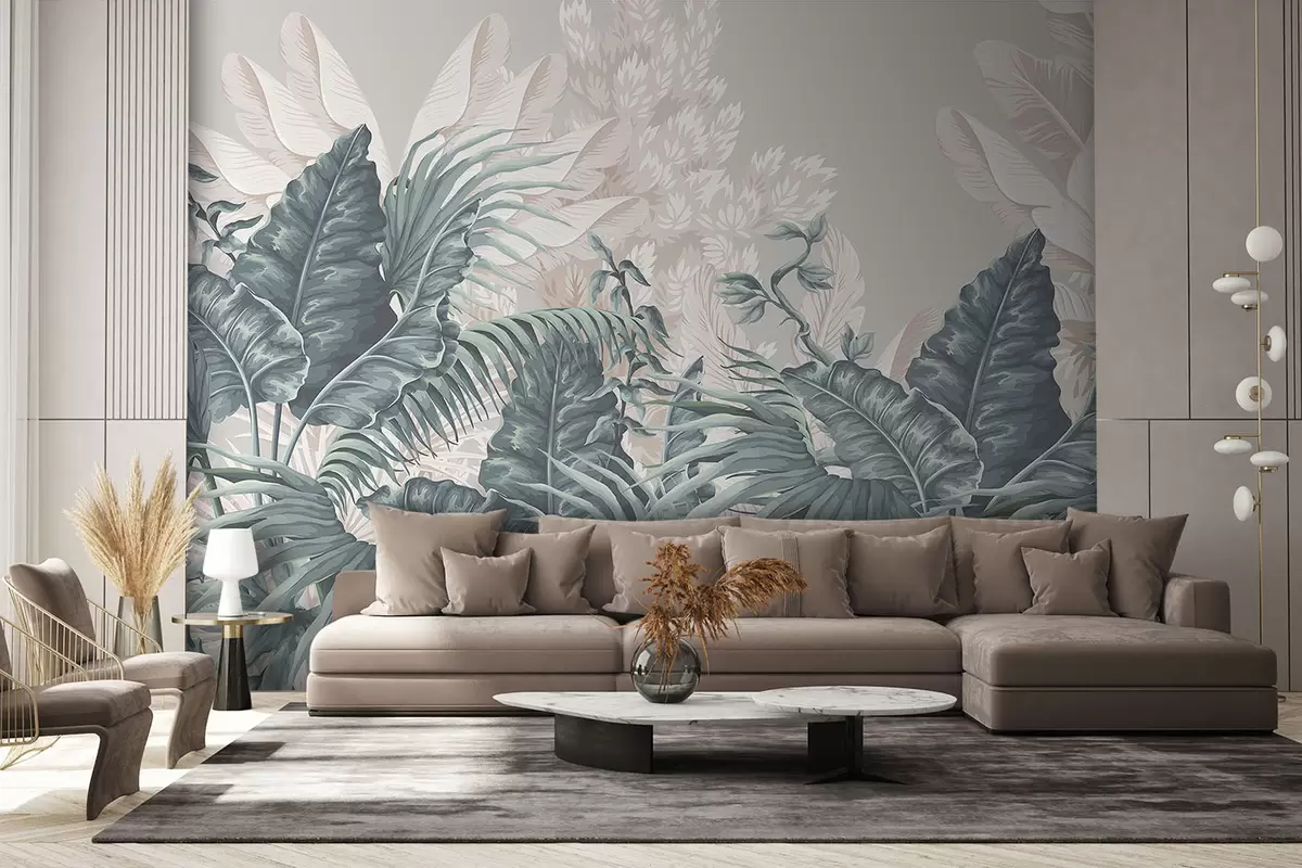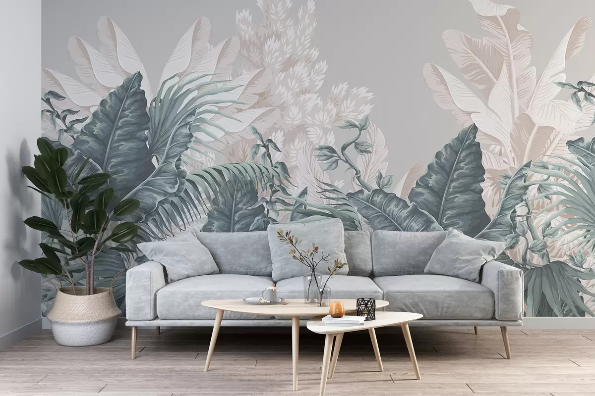 Fototapeedid Troopiline džunglistseen suurte roheliste lehtede ja lilledega esiplaanil, mis loob lopsaka atmosfääri Nr w08242