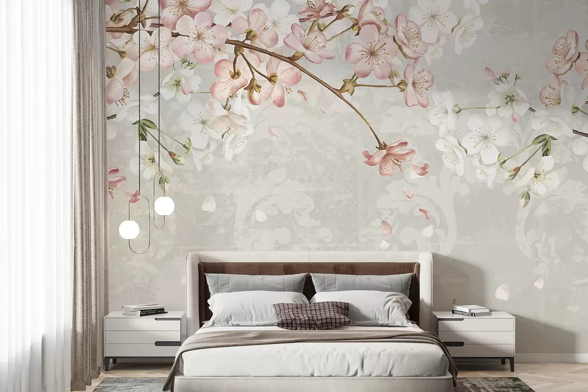 Fototapeedid Roosad ja valged kirsiõied täies õitsengus, pehmed kroonlehed langevad tekstuuriga beežil taustal Nr w08254v1