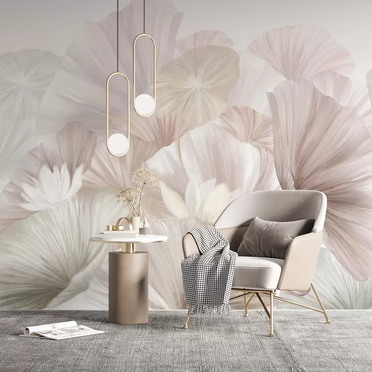 Fototapeedid Õrnad roosad lootose lehed koos valgete õitega, mille pehmed, sulelised kroonlehed on paigutatud looduslikku kunstikompositsioonile Nr w08265v1