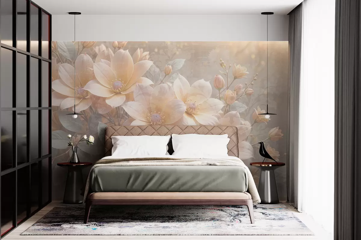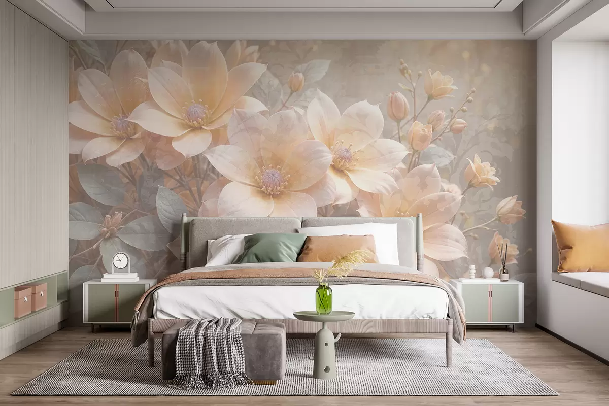 Fototapeedid Pastellvärvilised õrnade kroonlehtedega lilled hägusa tekstuuriga taustal, mis loob rahulikku atmosfääri Nr w08273