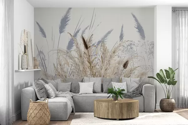 Fototapeedid Kõrged nisuvarred ja rohi, millel on heledal taustal kohevad valged sulestikud Nr w08282