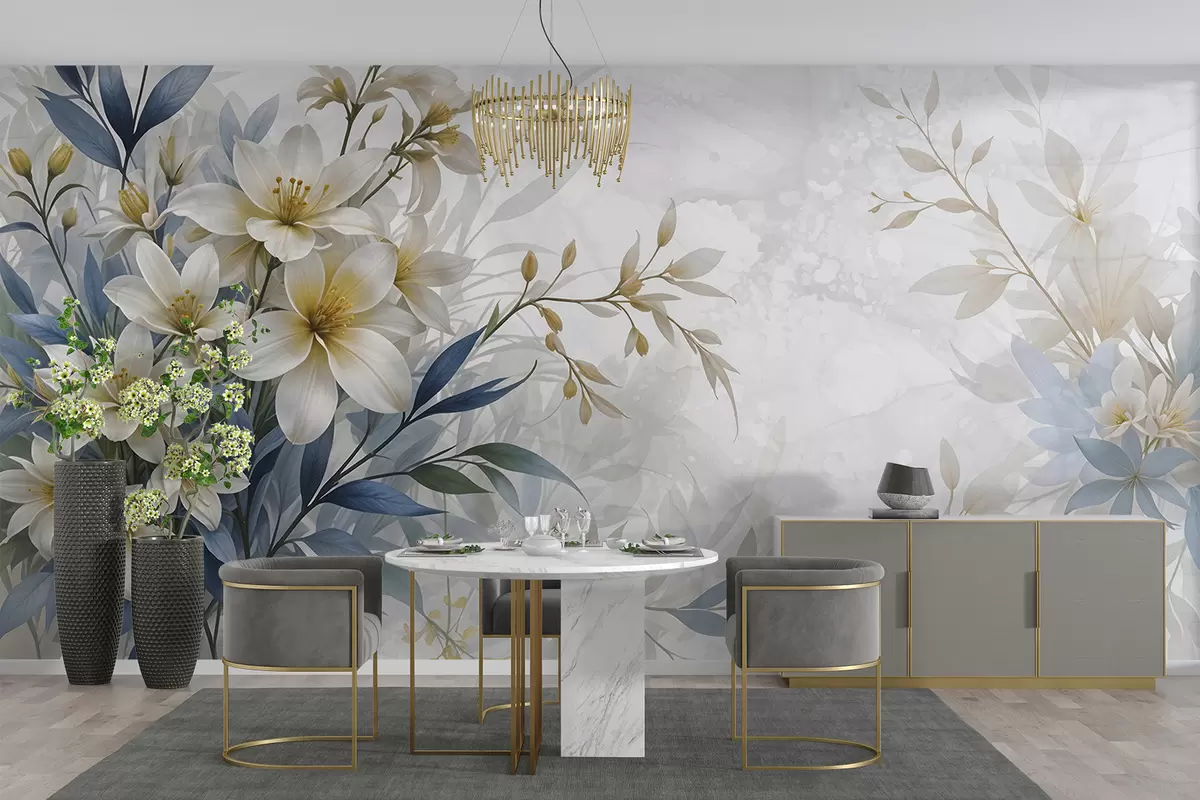 Fototapeedid Valge, beež ja sinine lillekimp koos õrnade lehtedega pehmel, hägusel taustal Nr w08314