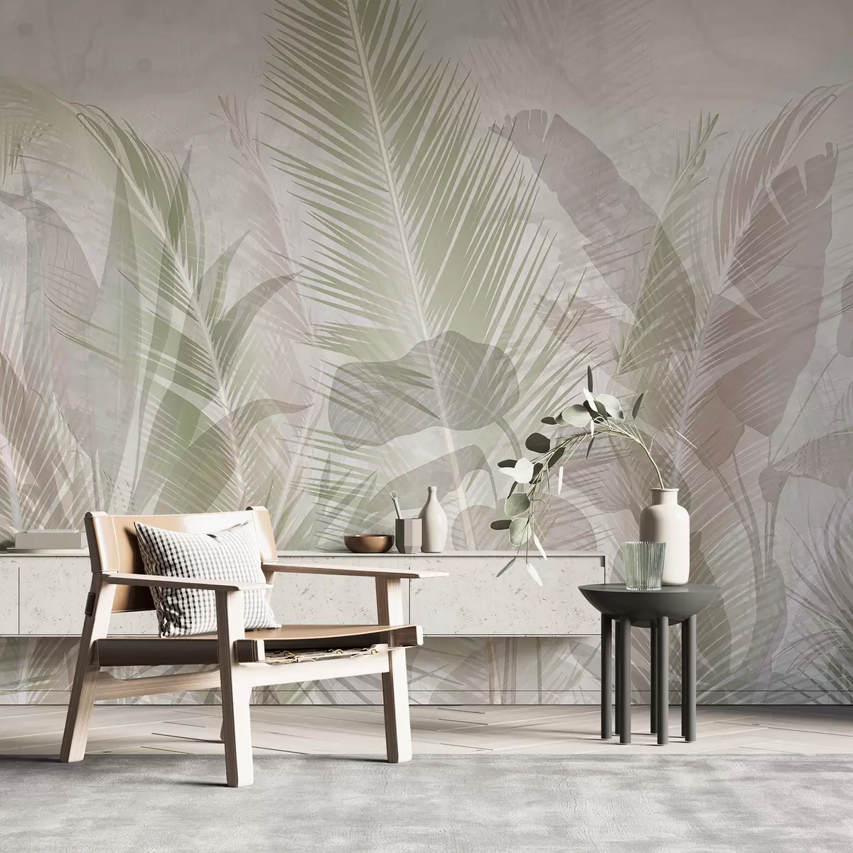 Fototapeedid Troopilised palmilehed pehmetes pastellvärvides, hägune ja udune tekstuuriline taust Nr w08326