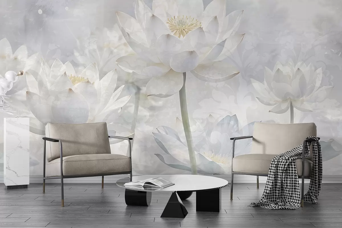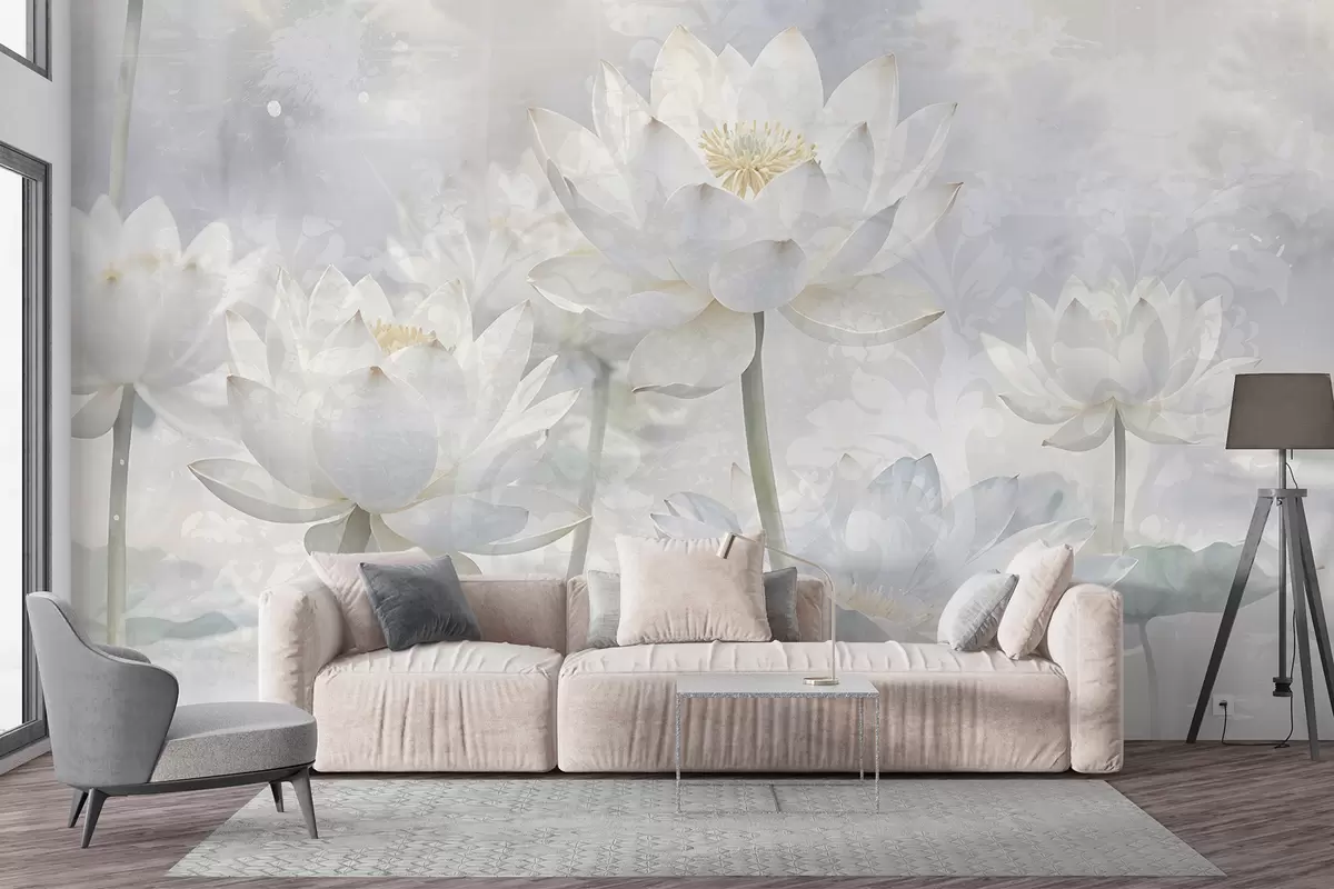 Fototapeedid Valged lootoslilled udusel, eeterlikul abstraktsel pastellmaastikul taustal Nr w08328