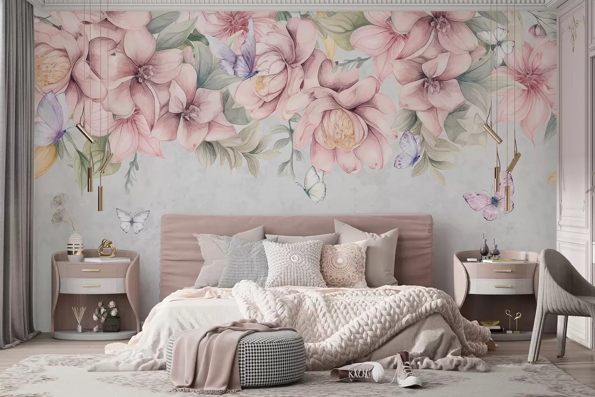 Fototapeedid Pehme roosa ja valge lilleline õrnade lillede ja lehtedega tekstuursel hallil taustal Nr w08331