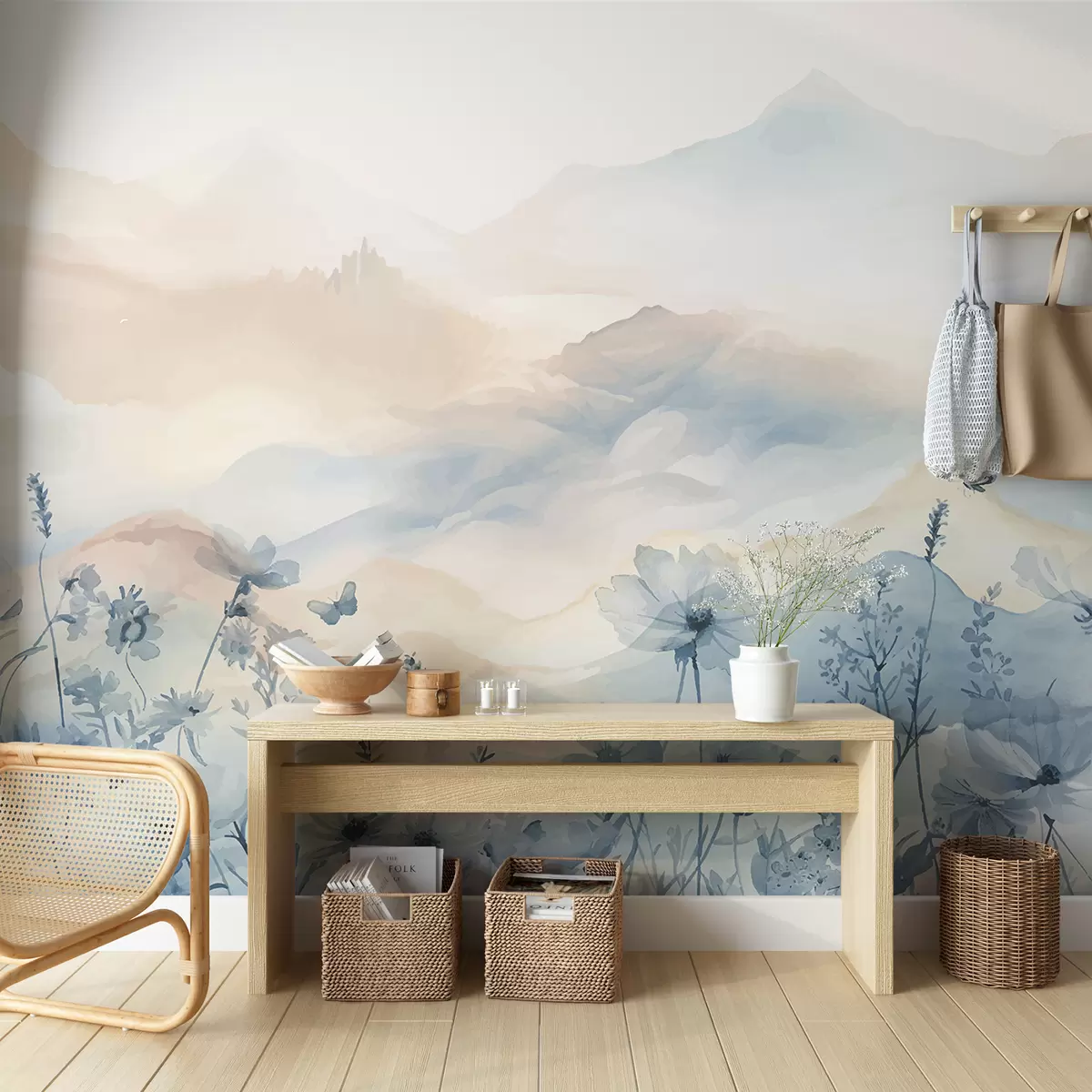 Fototapeedid Rahulik maastik, taustaks udune mäestik, mida ümbritseb õrnade siniste lillede väli Nr w08339