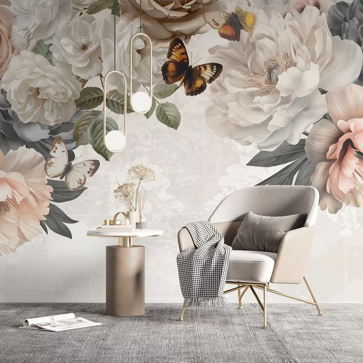 Fototapeedid Suured valged ja roosad pojengililled koos ühel õitel istuva liblikaga pehmel, hägustatud taustal Nr w08340