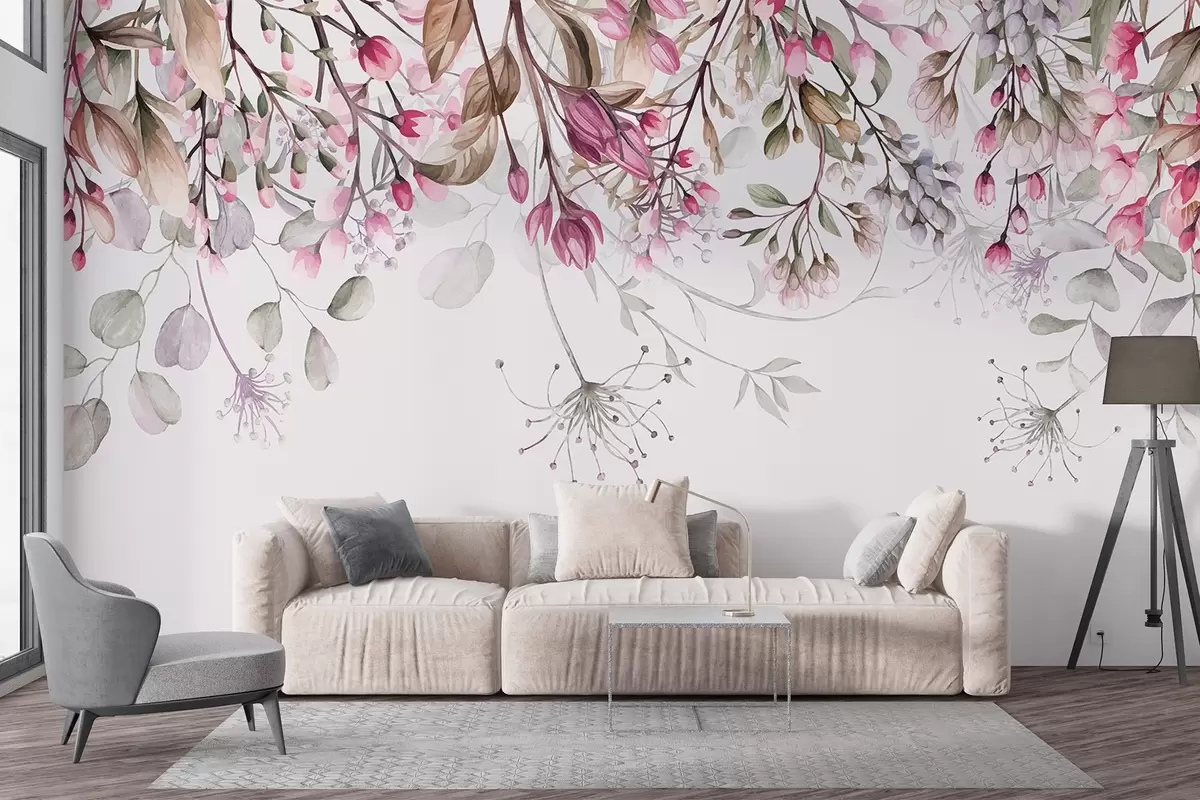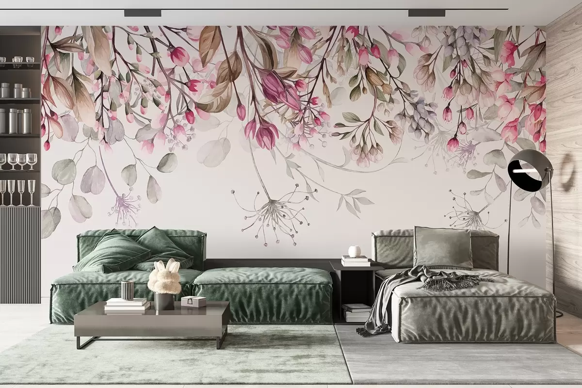 Fototapeedid Õrnad roosa ja valged lilleoksad koos lehtede ja kroonlehtedega, pastelsel hallil taustal Nr w08347