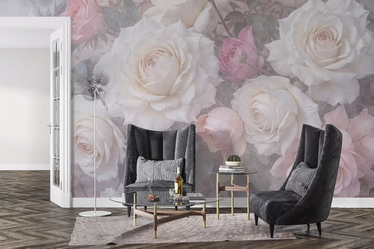 Fototapeedid Pehmed, pastelsetes toonides roosid ja ploomid hägusel, uduhallil taustal Nr w08352