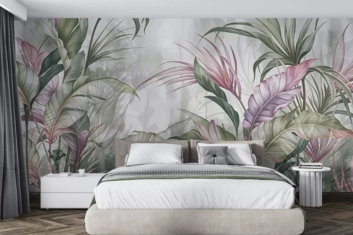 Fototapeedid Troopiline džungel suurte roheliste lehtede ja roosade protea lilledega, mille taust on hägune ja tekstuurne Nr w08375