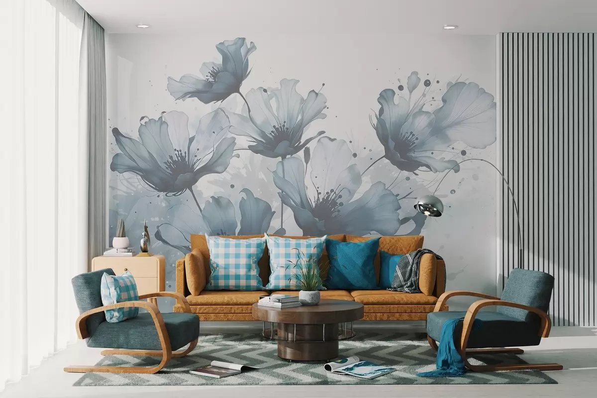 Fototapeedid Õrnad sinised lilled, mille õrnad, hägused kroonlehed ja akvarellilaigud on heledal taustal Nr w08376