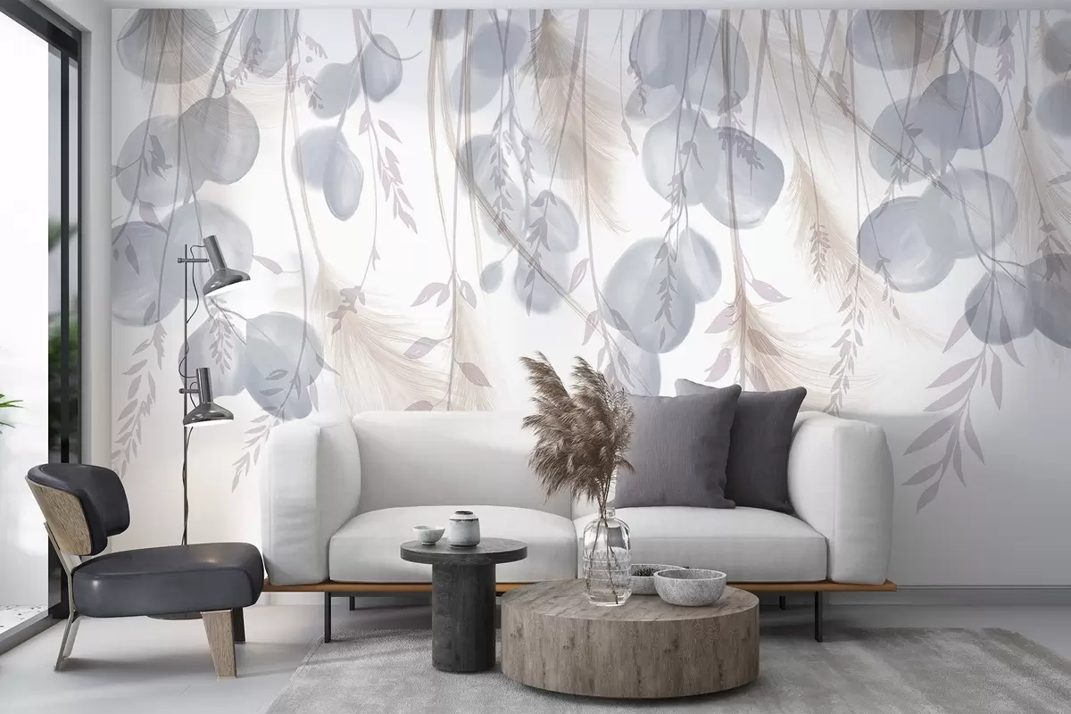 Fototapeedid Õrnad sinised ja pastelsed beežid eukalüpti lehed langevad, luues rahulikku ja rahustavat atmosfääri Nr w08380v1