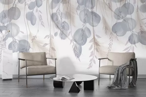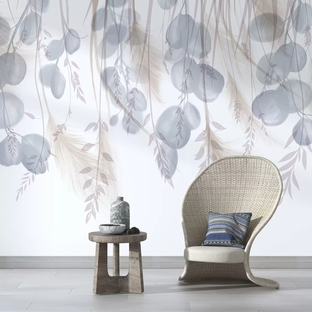 Fototapeedid Õrnad sinised ja pastelsed beežid eukalüpti lehed langevad, luues rahulikku ja rahustavat atmosfääri Nr w08380v1