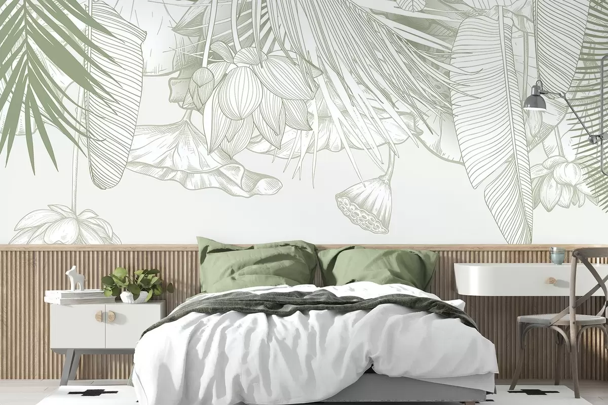Fototapeedid Suurte, kattuvate kroonlehtede ja lehtedega ühevärvilise rohelise lilleprindi lähivaade Nr w08389v1