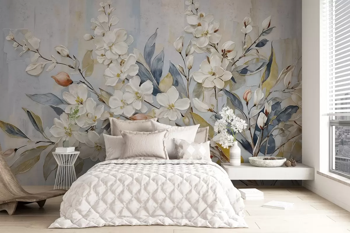 Fototapeedid Lillelised pastelsed õrnad valged lilled kollase keskusega, mida ümbritsevad lopsakad rohelised lehed ja oksad Nr w08399v1