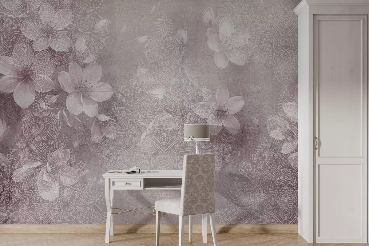 Fototapeedid Pehme fookusega joonistus õrnadest valgetest lilledest hägustatud tekstuuriga pitsist bordo taustal Nr w08405v2