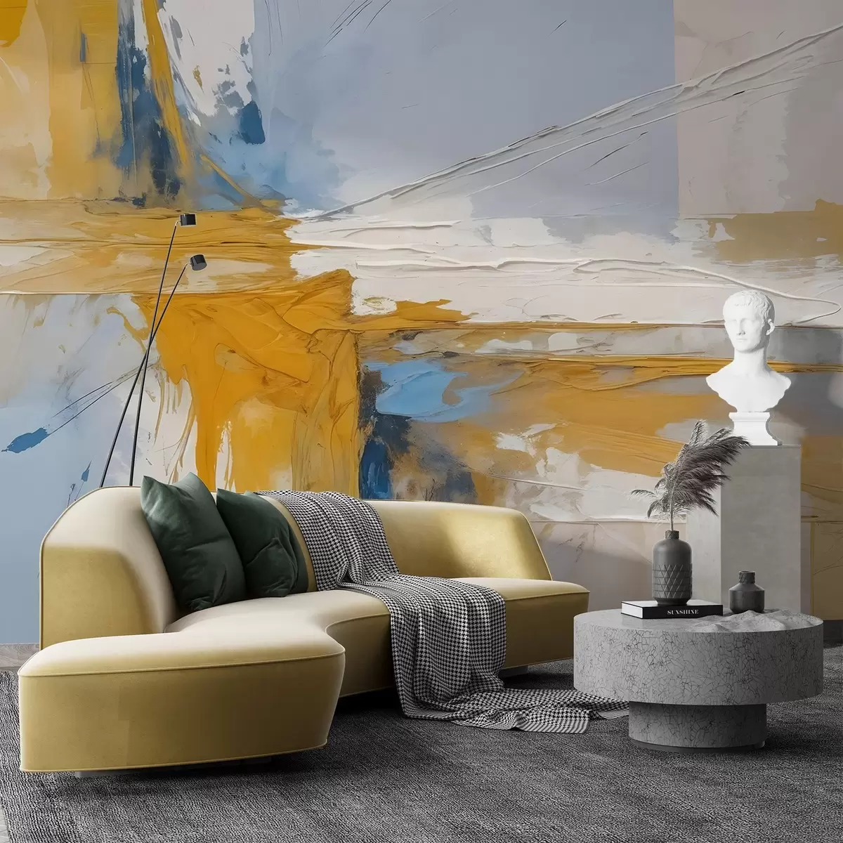 Fototapeedid Minimalistlik abstraktse kunsti kompositsioon, millel on julged pintslitõmbed kollase, sinise ja valge värviga Nr w08414