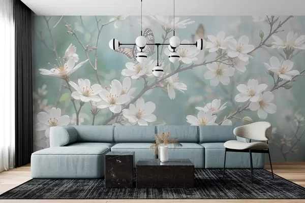 Fototapeedid Valge liblikas oksal koos õrnade valgete kirsiõitega esiplaanil hägusel taustal Nr w08421