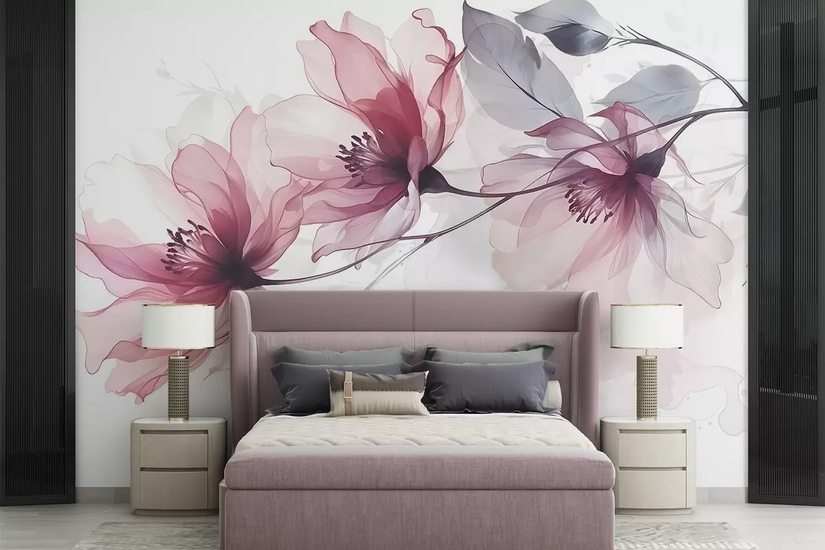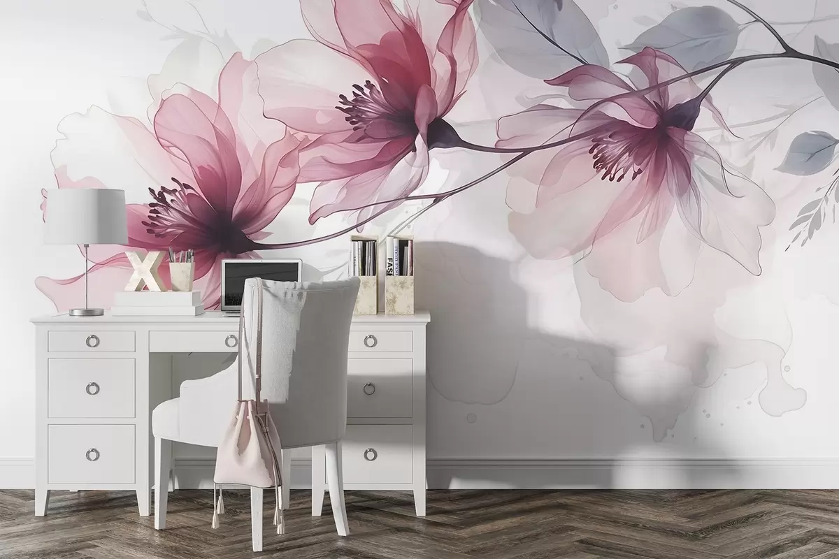 Fototapeedid Õrnad läbipaistvad roosad ja hallid õied pehme, hägusa kroonlehega valgel taustal Nr w08429