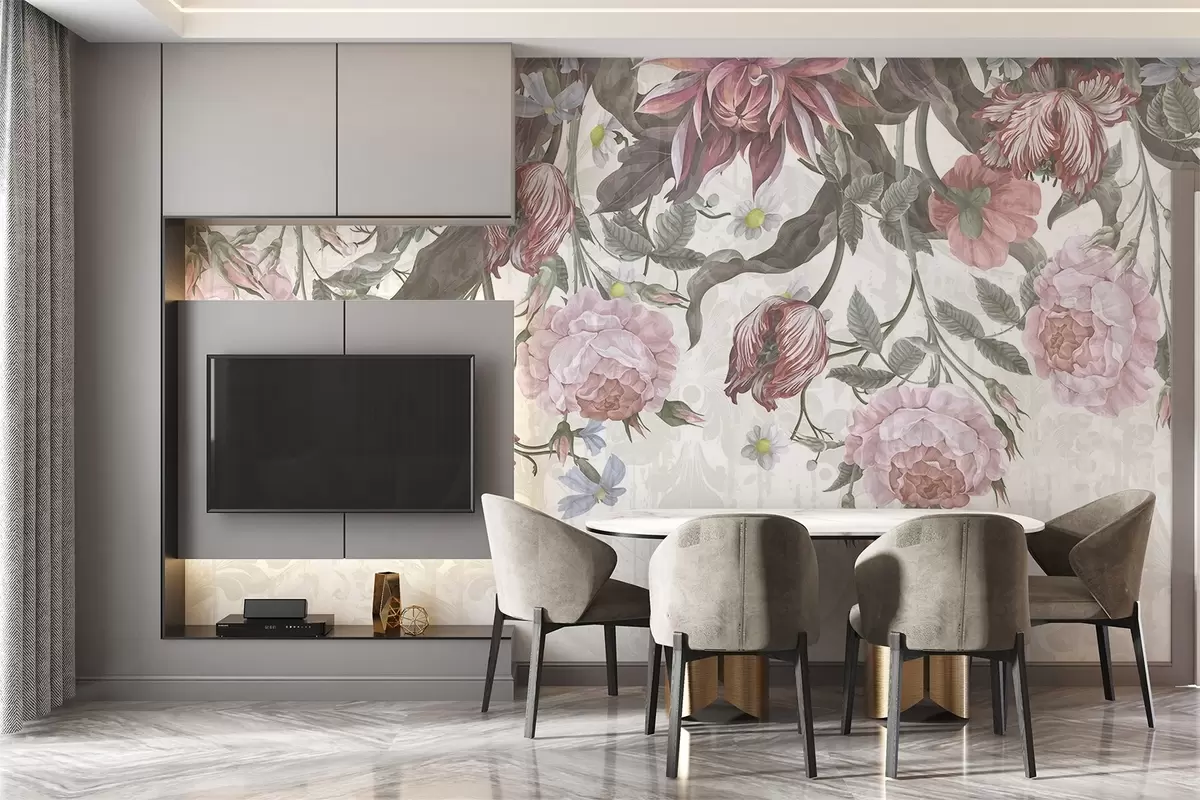 Fototapeedid Lopsakas lillekomplekt, milles on suured roosad ja valged lilled, rohelised lehed ja varred Nr w08435