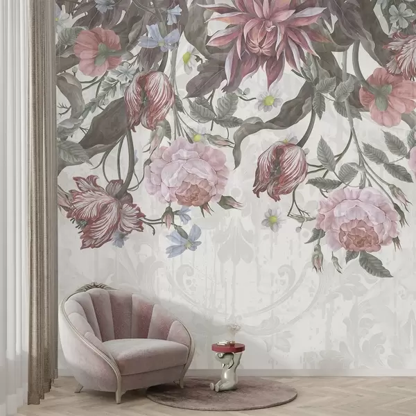 Fototapeedid Lopsakas lillekomplekt, milles on suured roosad ja valged lilled, rohelised lehed ja varred Nr w08435