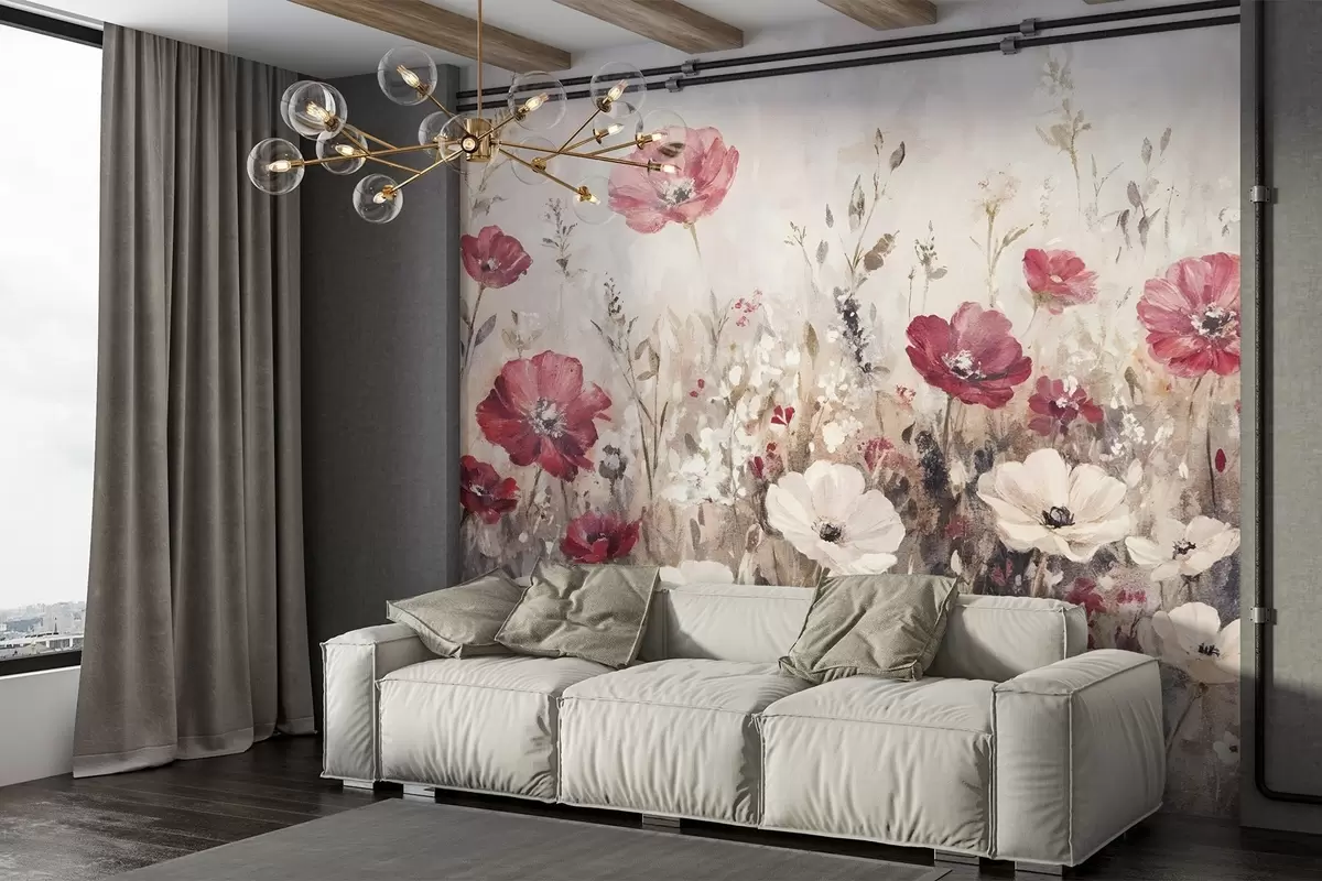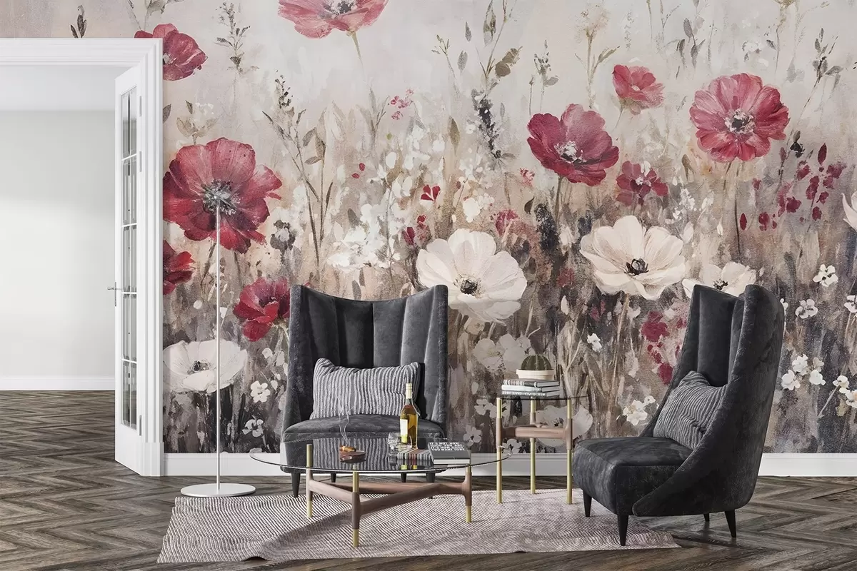 Fototapeedid Põld elavatest punastest ja valgetest lilledest pehmel, udusel taustal õlimaalide stiilis Nr w08438