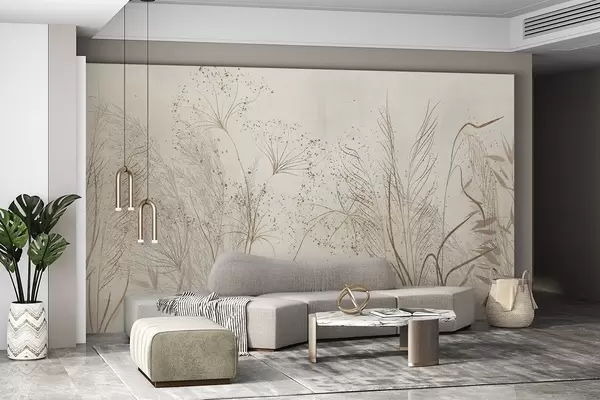 Fototapeedid Ühevärviline illustratsioon erinevatest beežidest taimedest ja õrnade, vildakate joonte ja tekstuuridega tüvikutest Nr w08441